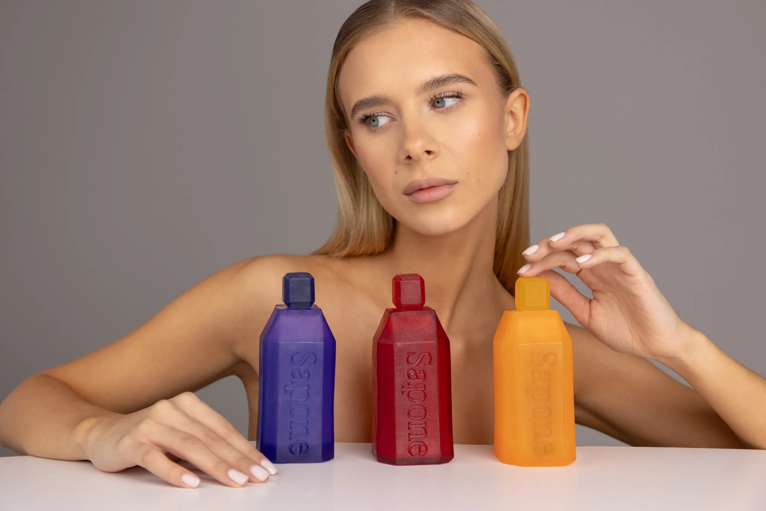 A soap bottle is an innovative and eco-friendly container made entirely of natural soap. It can hold up to 200 ml of liquid products such as shampoo, shower gel or liquid soap. When the liquid inside runs out, the bottle itself can be used as a soap.